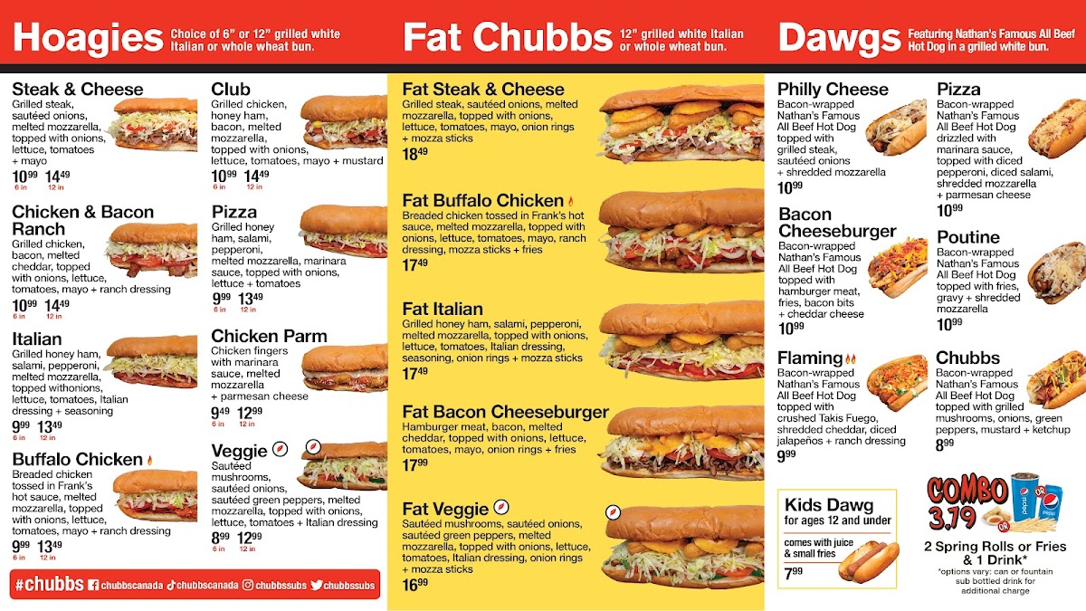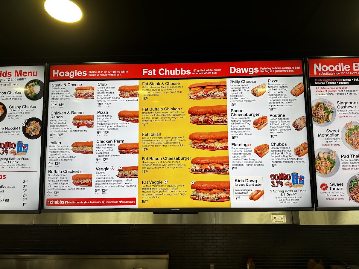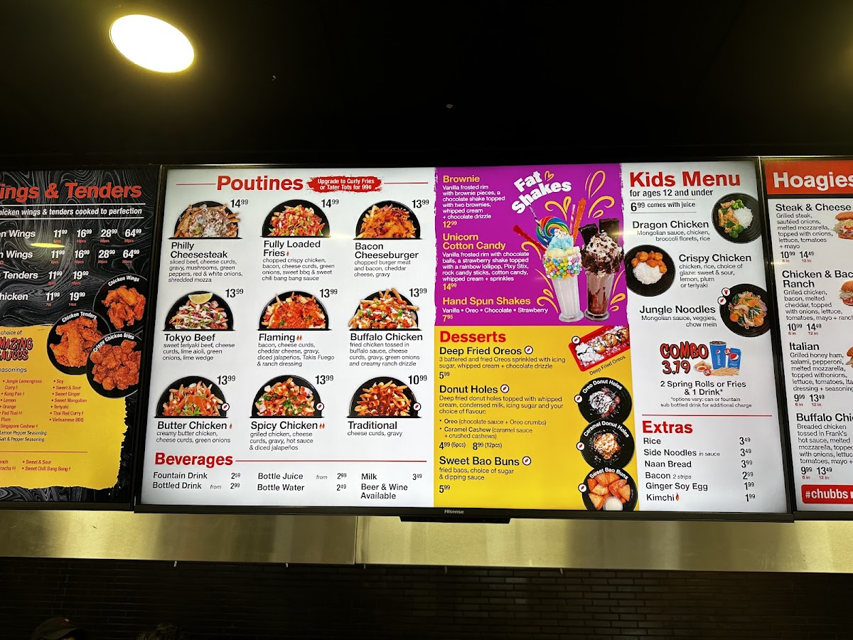 For those looking for a hearty meal, the Fat Chubbs options like the Fat Steak & Cheese, Fat Bacon Cheeseburger, and Fat Italian are sure to hit the spot. And don't forget to try out their signature Dawgs, Hoagies, Poutines, Wings & Tenders, Sidekicks, Desserts, Non-Alcoholic Beverages, Extras, Kid's Menu, Noodle Box, Rice Box, and Soups & Stuffs for a truly satisfying dining experience.